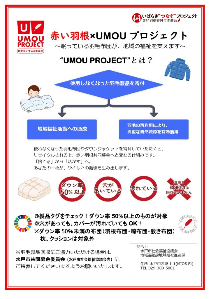 本会では、使われなくなった羽毛製品を回収し、再資源化につなげる「UMOU PROJECT」に取り組んでいます。