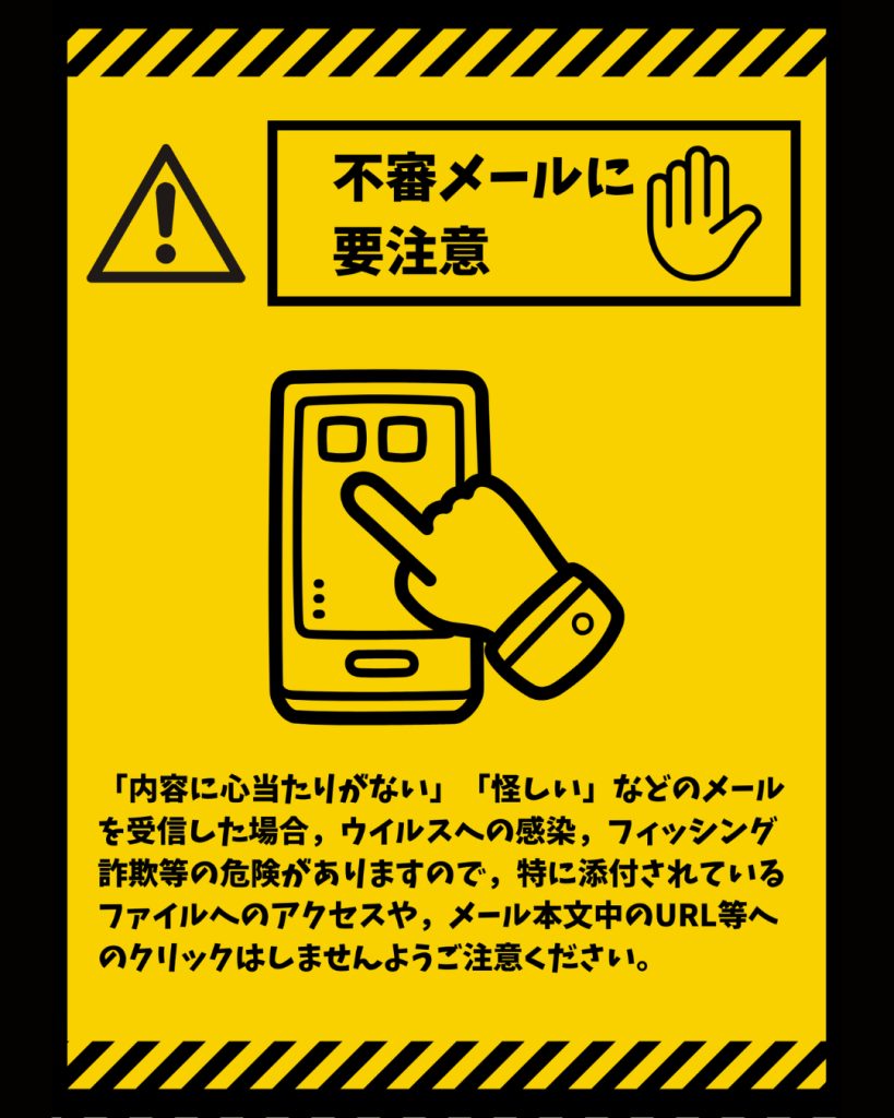 このようなメールを受け取った場合は絶対に返信したり、メール本文中のURL等へのクリックはしませんようご注意ください。